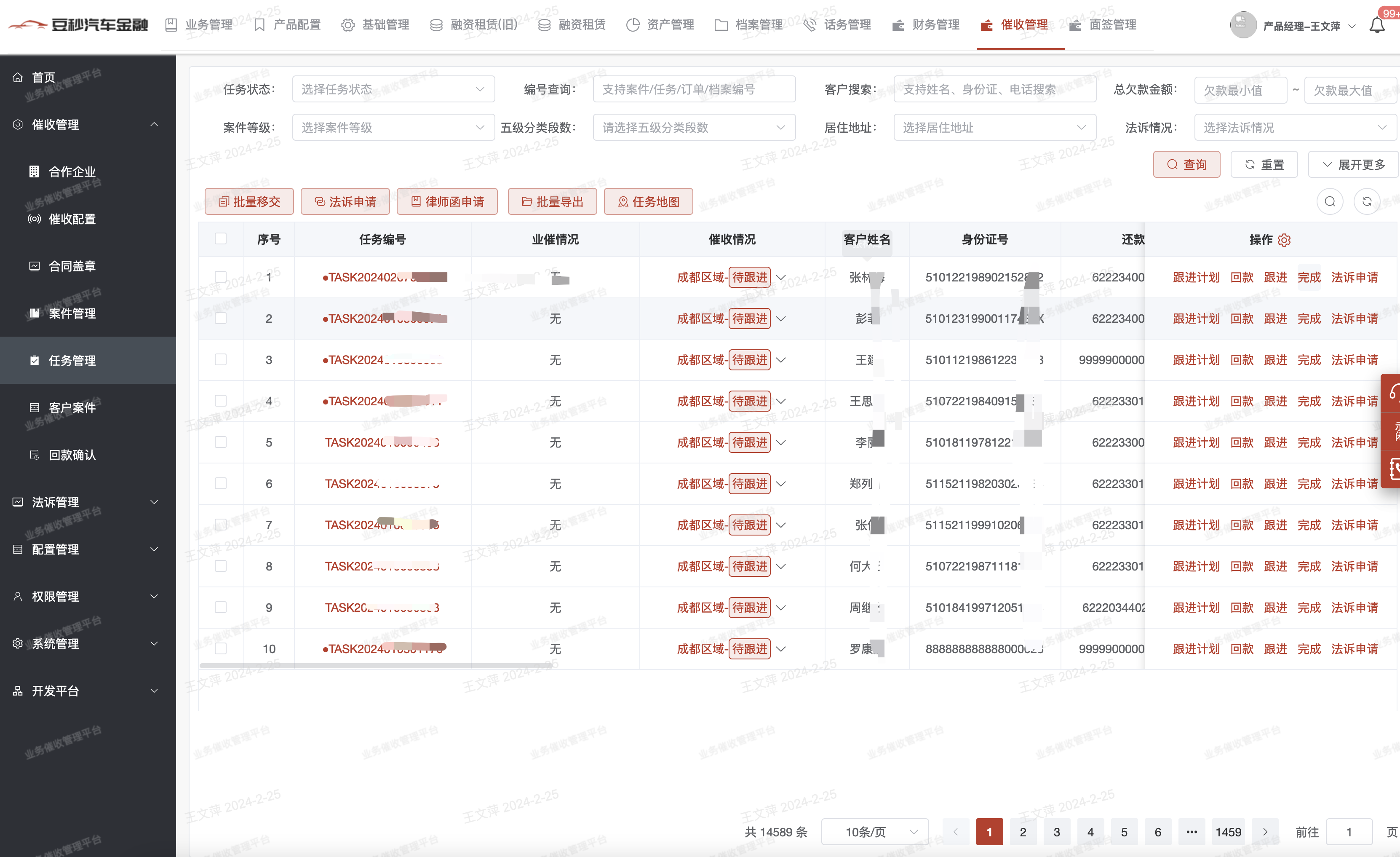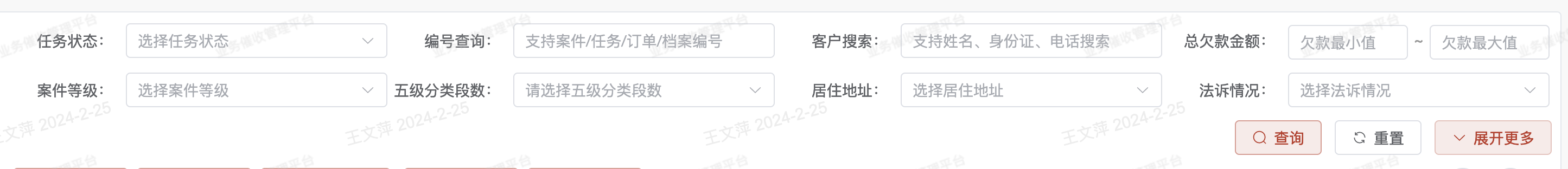 3、搜索区域:支持任务状态、编号、客户姓名/身份证/电话、总欠款金额范围、案件等级、五级分类段数、居住地址、发诉情况、业催情况、负责催收、业务公司、放款时间范围进行搜索;