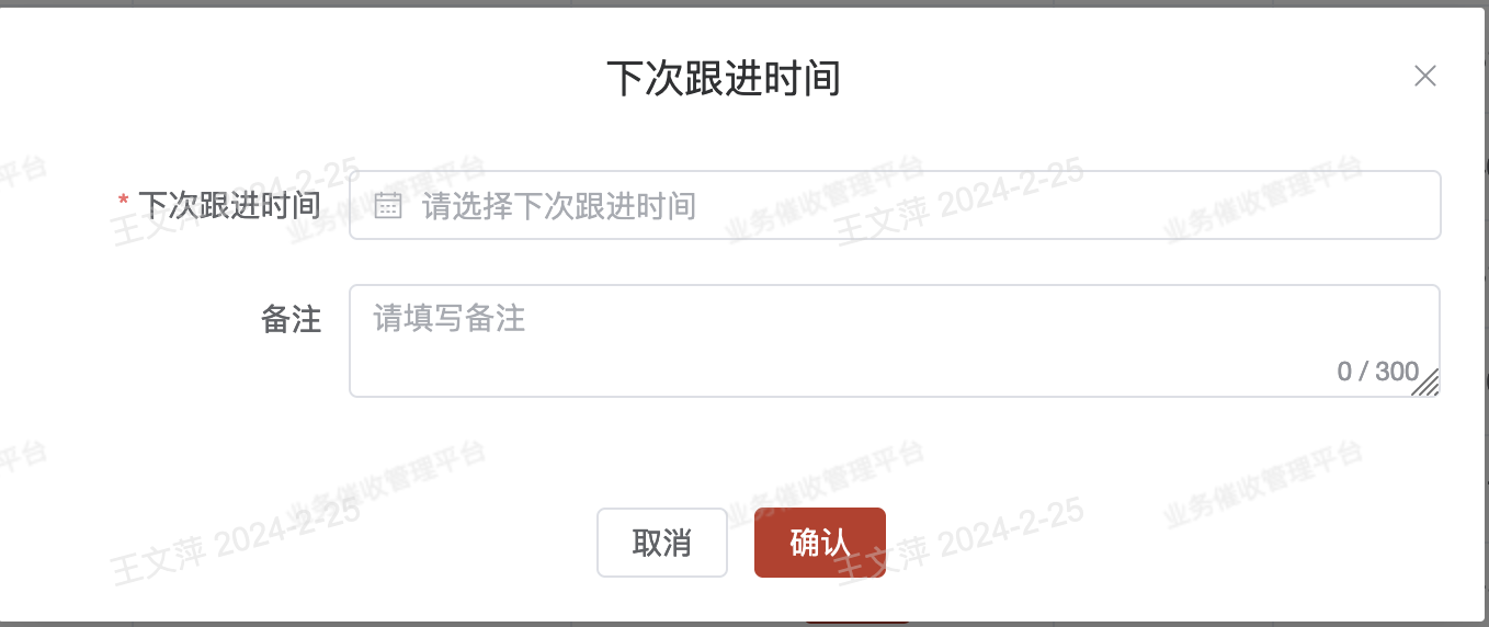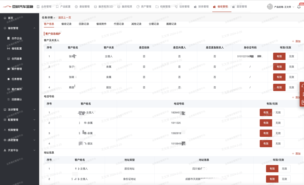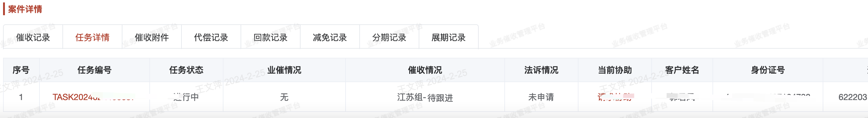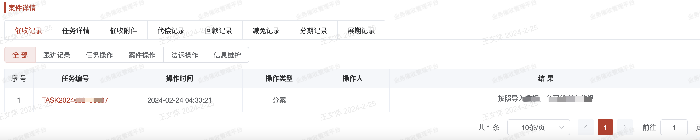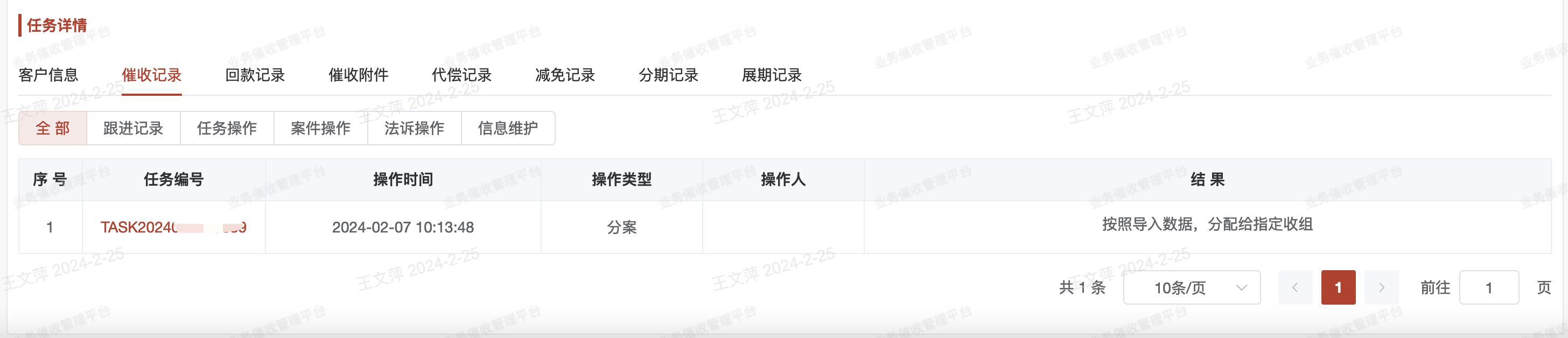 ii.催收记录:展示该任务的催收记录,包括跟进记录、任务操作、案件操作、法诉操作、信息维护记录;