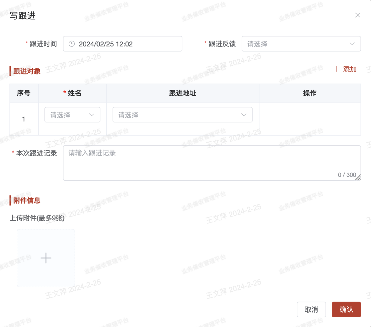 l)跟进:记录任务跟进情况,填写后生成跟进记录;