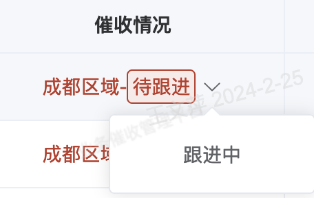 c)催收情况:任务分配过来默认待跟进,提醒用户进款跟进。此处点击下拉箭头可手动切换为跟进中状态;