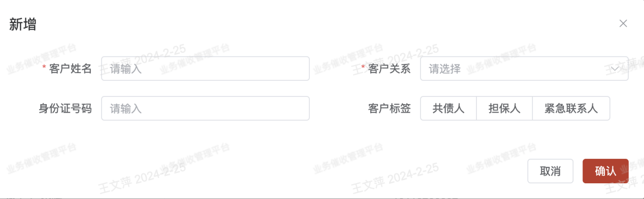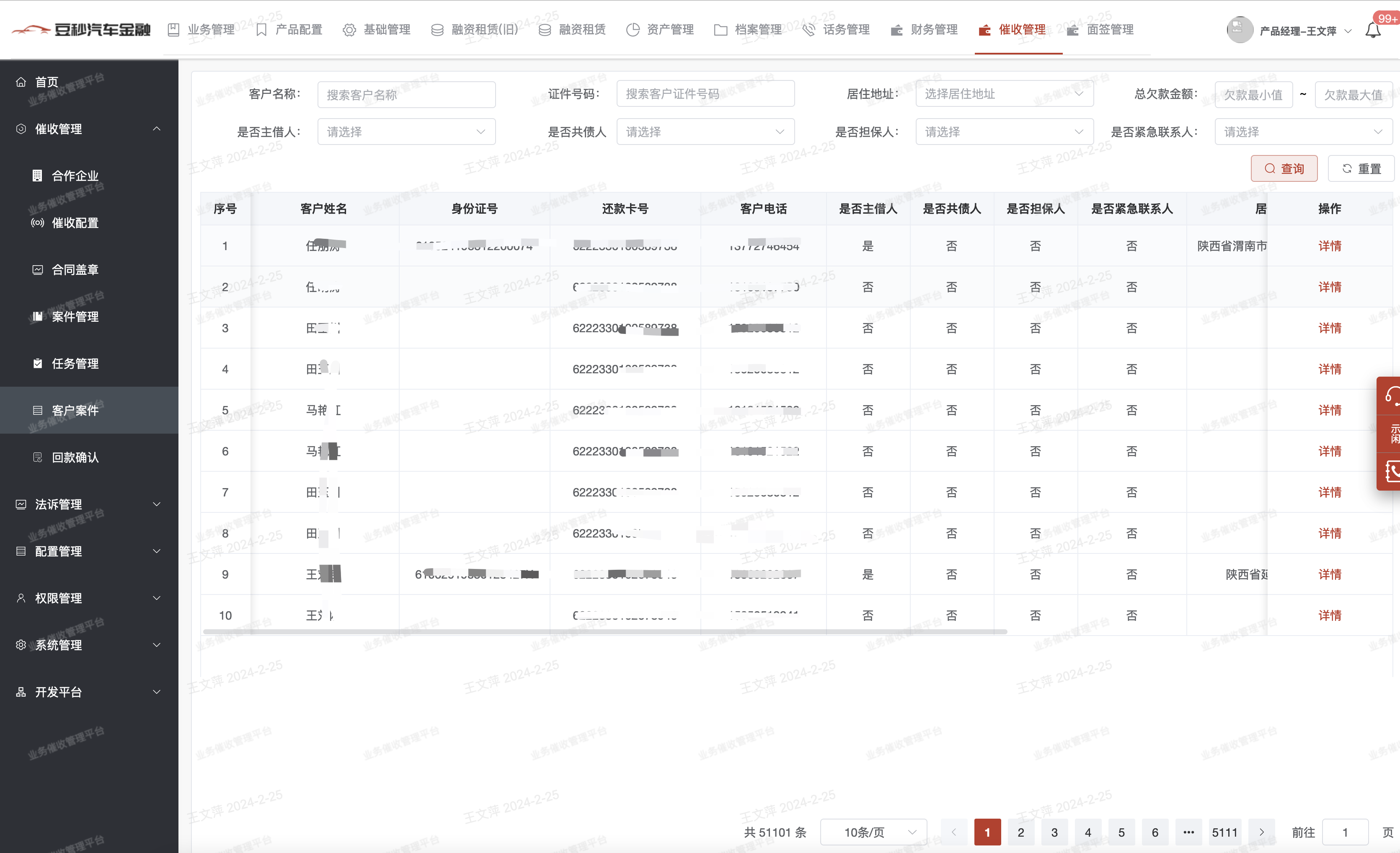 3、搜索:支持客户名称、证件号码、居住地址、总欠款金额范围、是否主借人、是否公债人、是否担保人、是否紧急联系人进行检索;