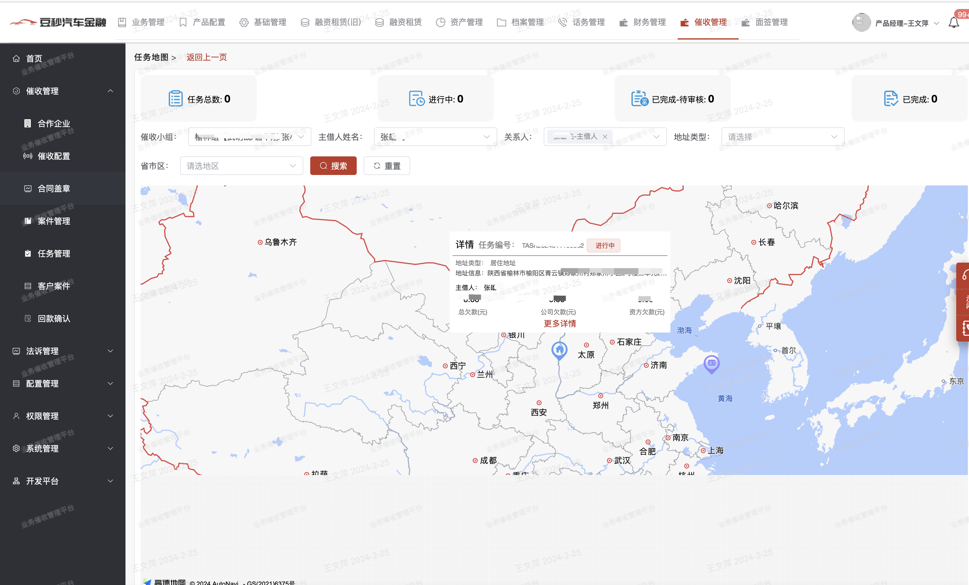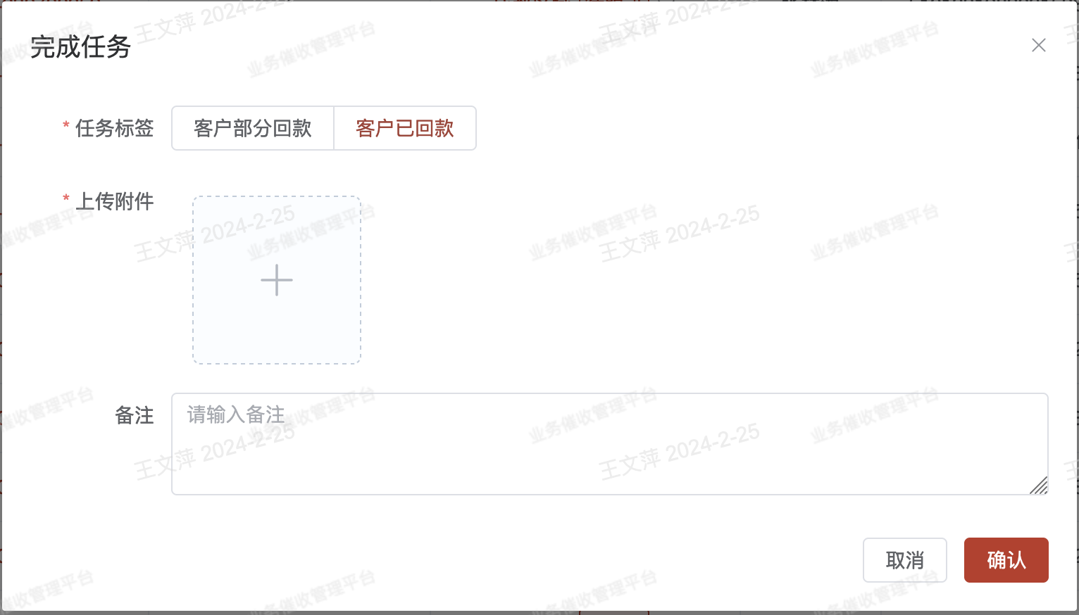m)完成:根据实际情况,支持手动完成任务,完成任务会触发OA流程,审批通过后该催收任务完成;