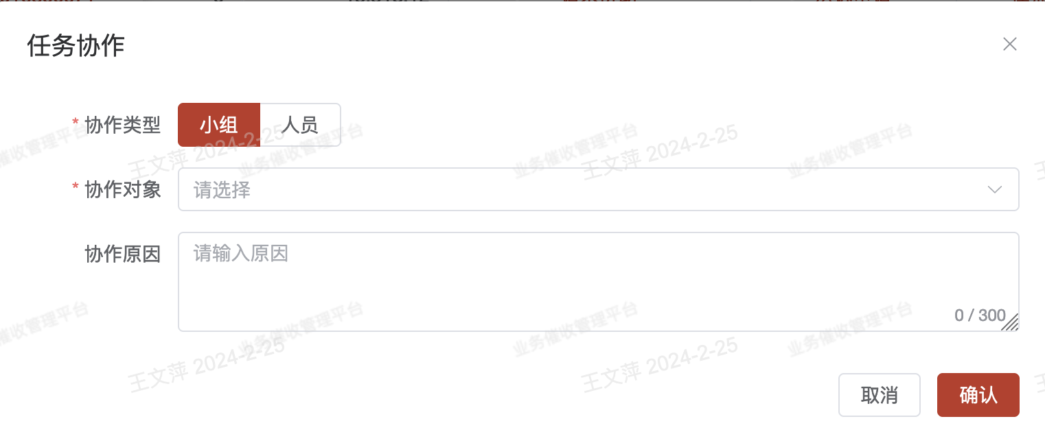 e)当前协助:可以选择外省催收小组进行协助催收。提交后会触发OA流程,由本公司负责人、请求协助负责人审批通过后,协助的催收小组也可看见该任务;