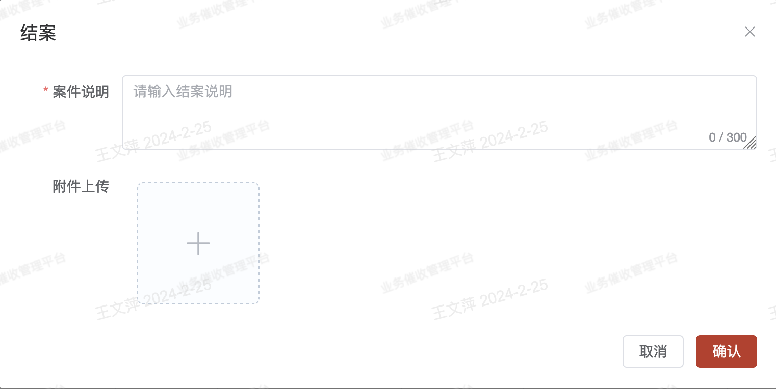 f)结案:点击可结束案件,填写结案说明和附件,结束催收任务;