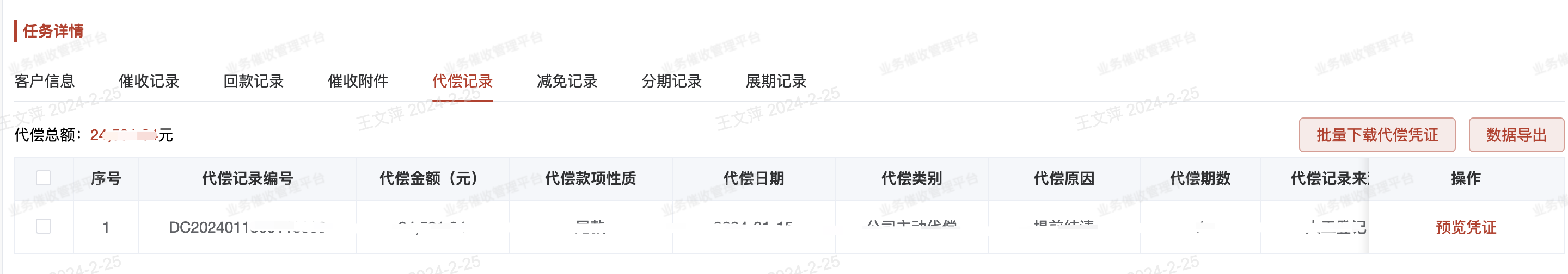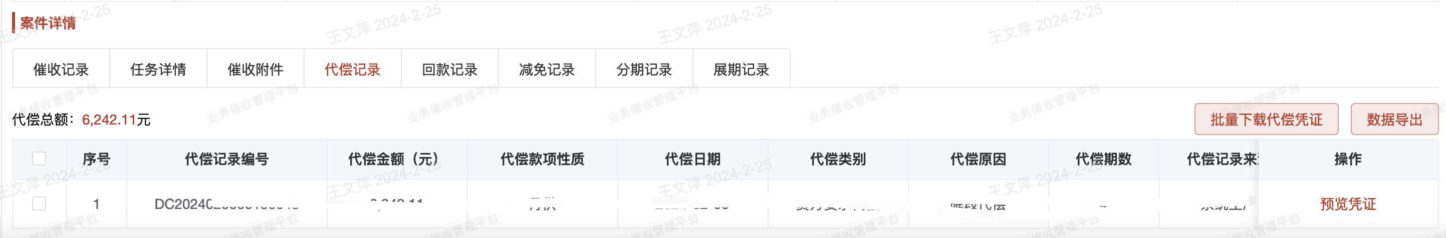 iv.代偿记录:该案件关联的订单代偿记录,可在此处查询;支持下载代偿凭证、数据导出,凭证预览;
