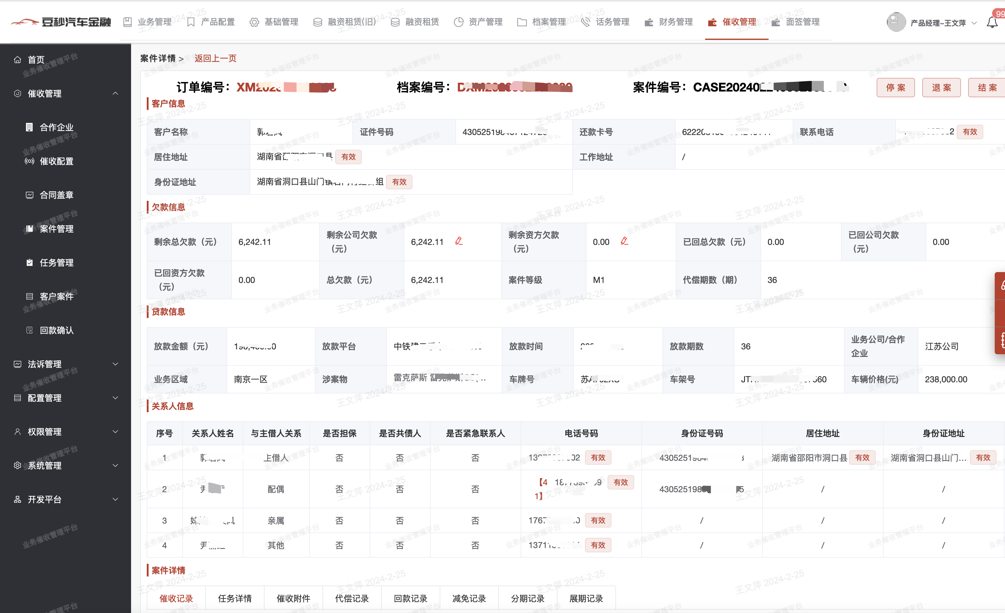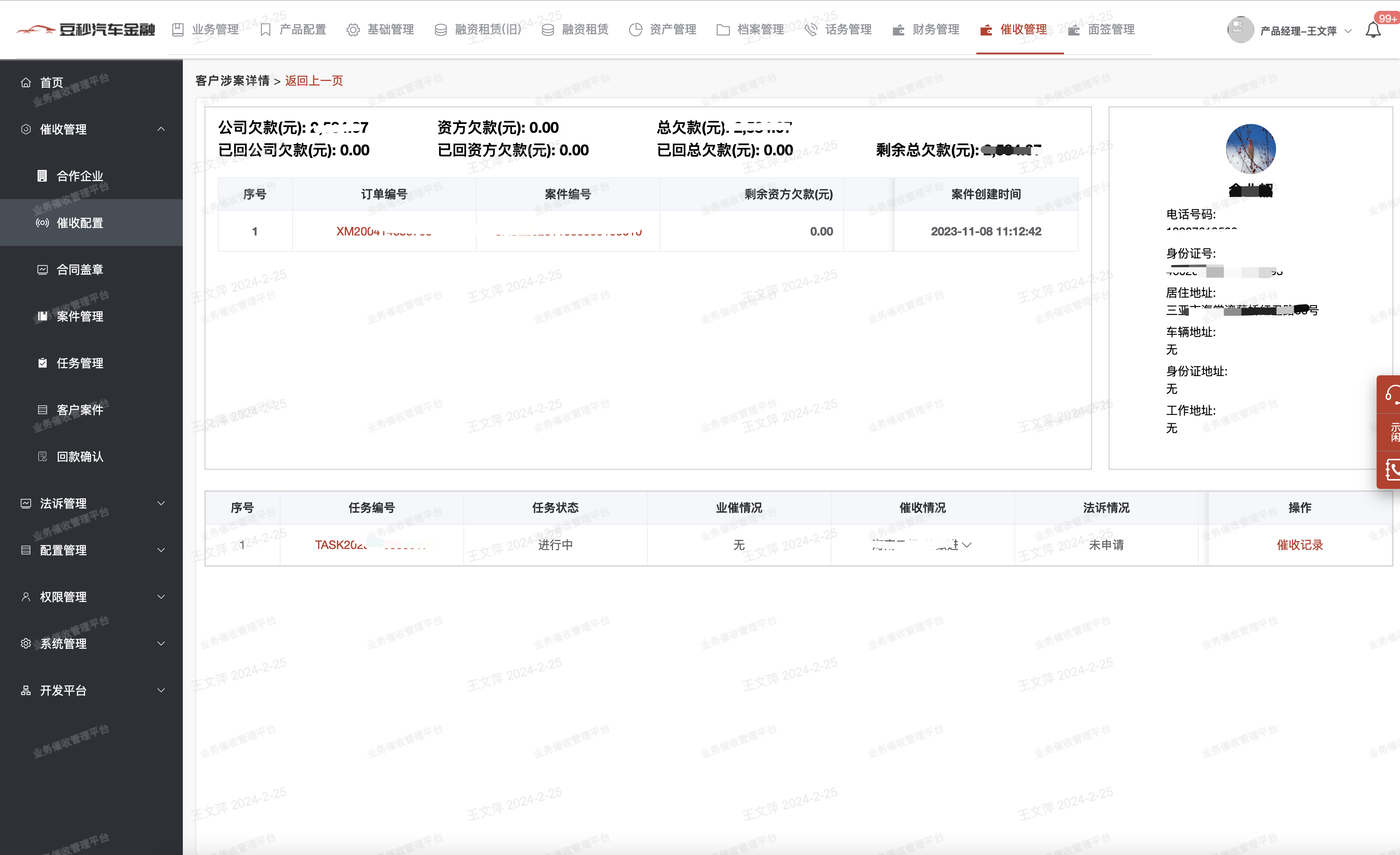 i.催收记录:包括跟进记录、任务操作记录、案件操作记录、法诉操作记录、信息维护记录;