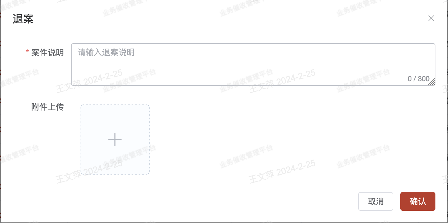 e)退案:点击可退回案件,填写退案说明和附件,退回催收任务;