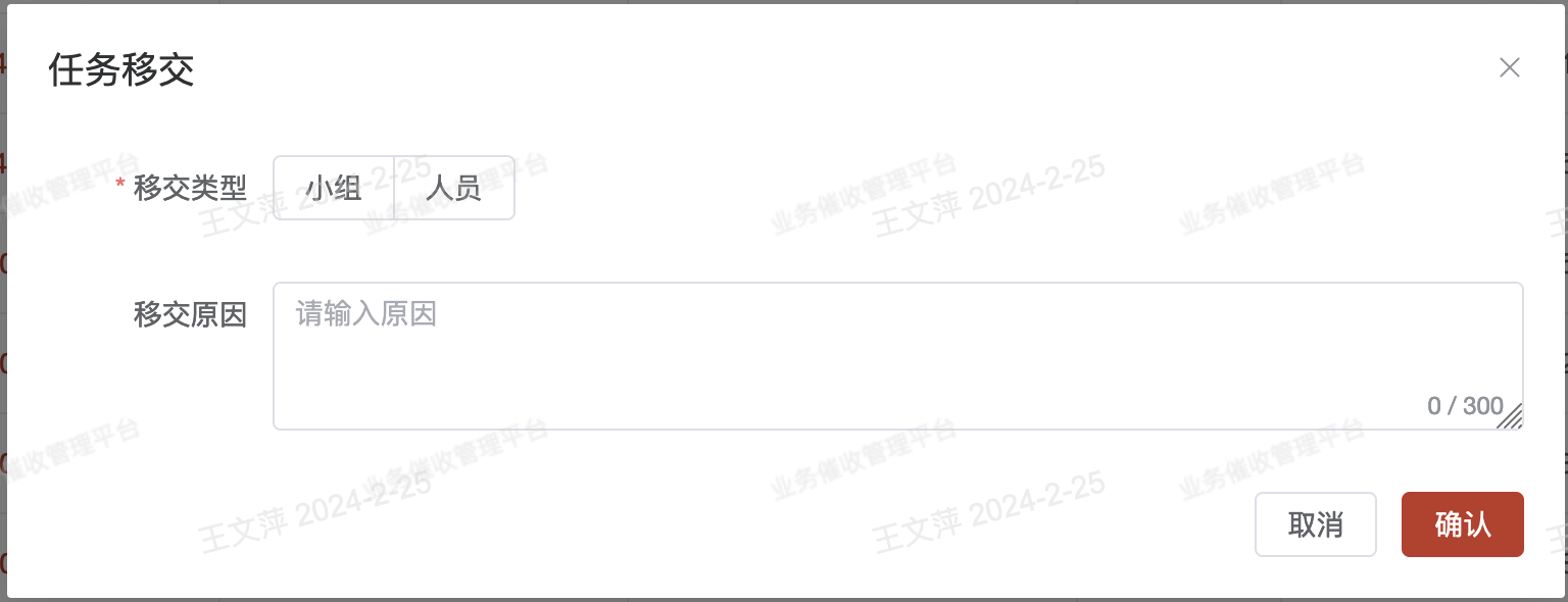 a)批量移交:支持多选任务进行批量移交至同一个催收小组,移交前提是该任务没有处于任务审批流程中;