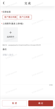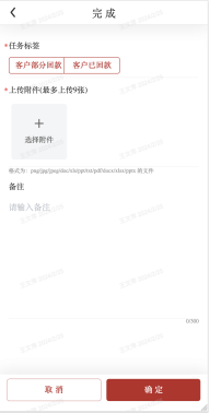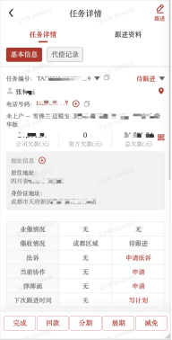 e)完成:根据实际情况,支持手动完成任务,完成任务会触发OA流程,审批通过后该催收任务完成;