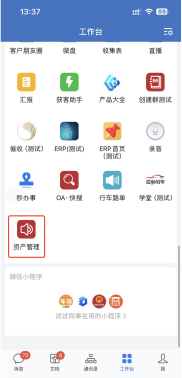 1、企业微信选择【工作台】-【资产管理】点击进入,自动登录;