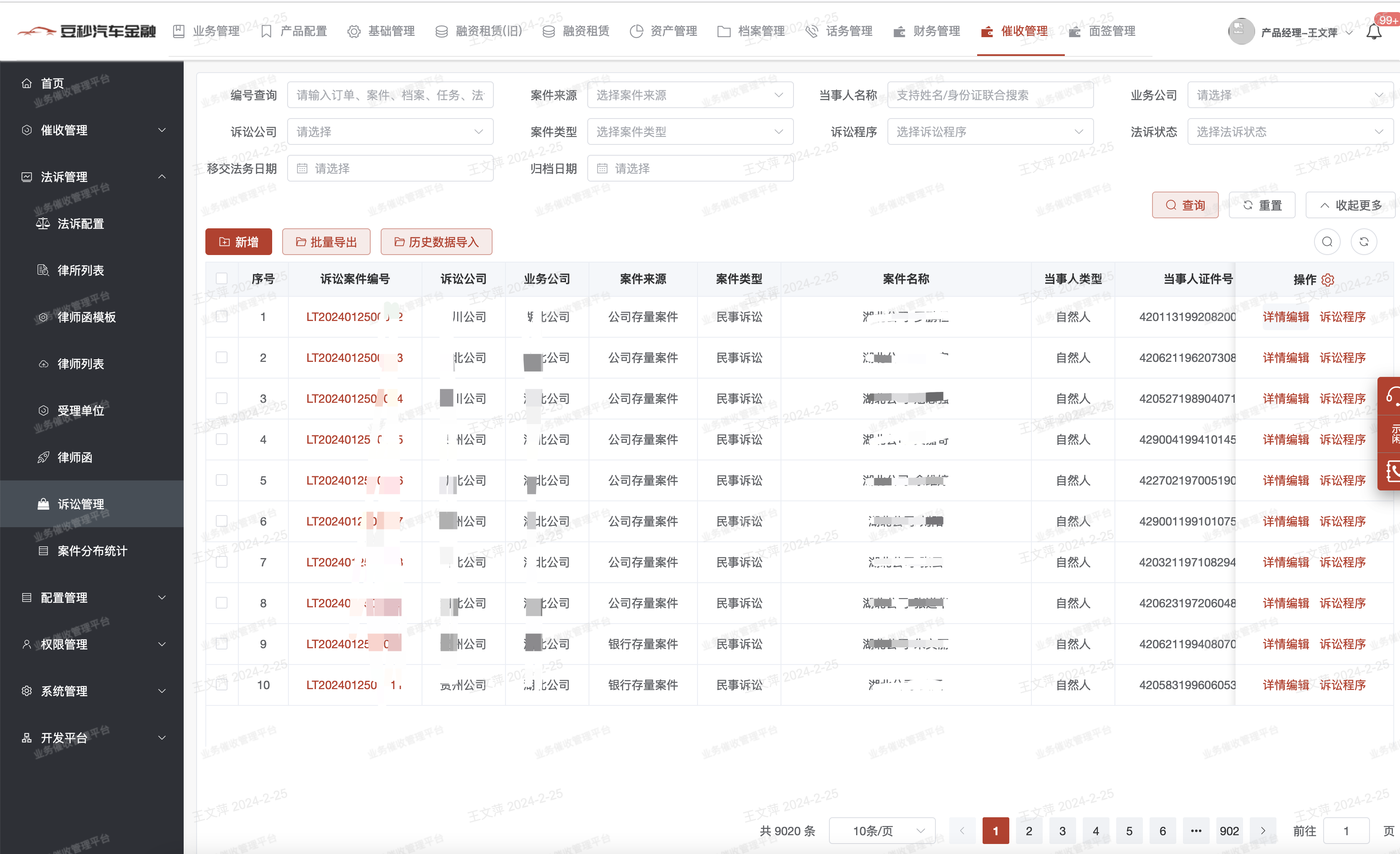 a)此模块展示在催收任务申请的法诉案件记录,通过审批后在该列表看到案件信息;