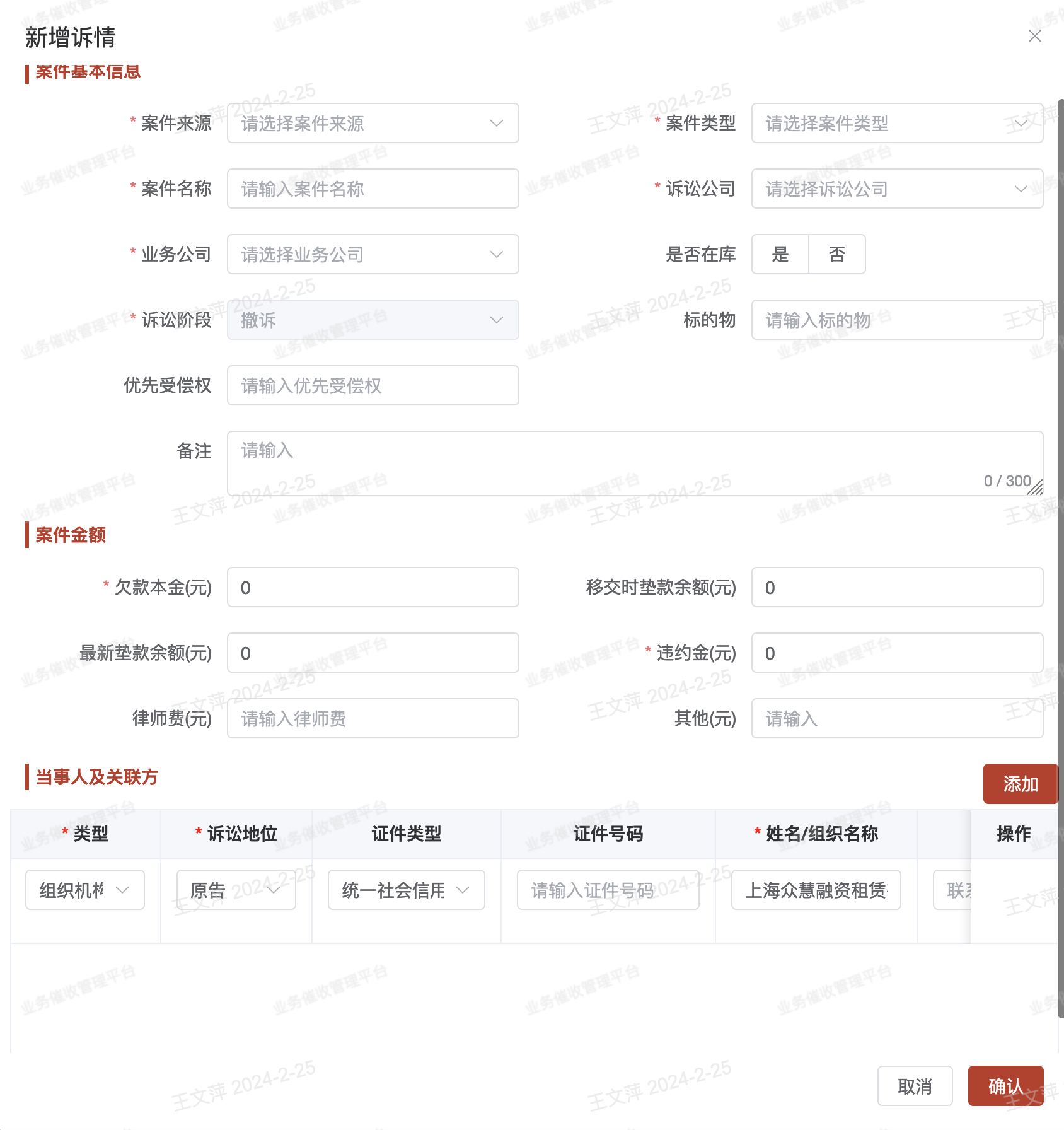 c)当事人信息:关联订单的当事人信息,若是新增则手动补齐;