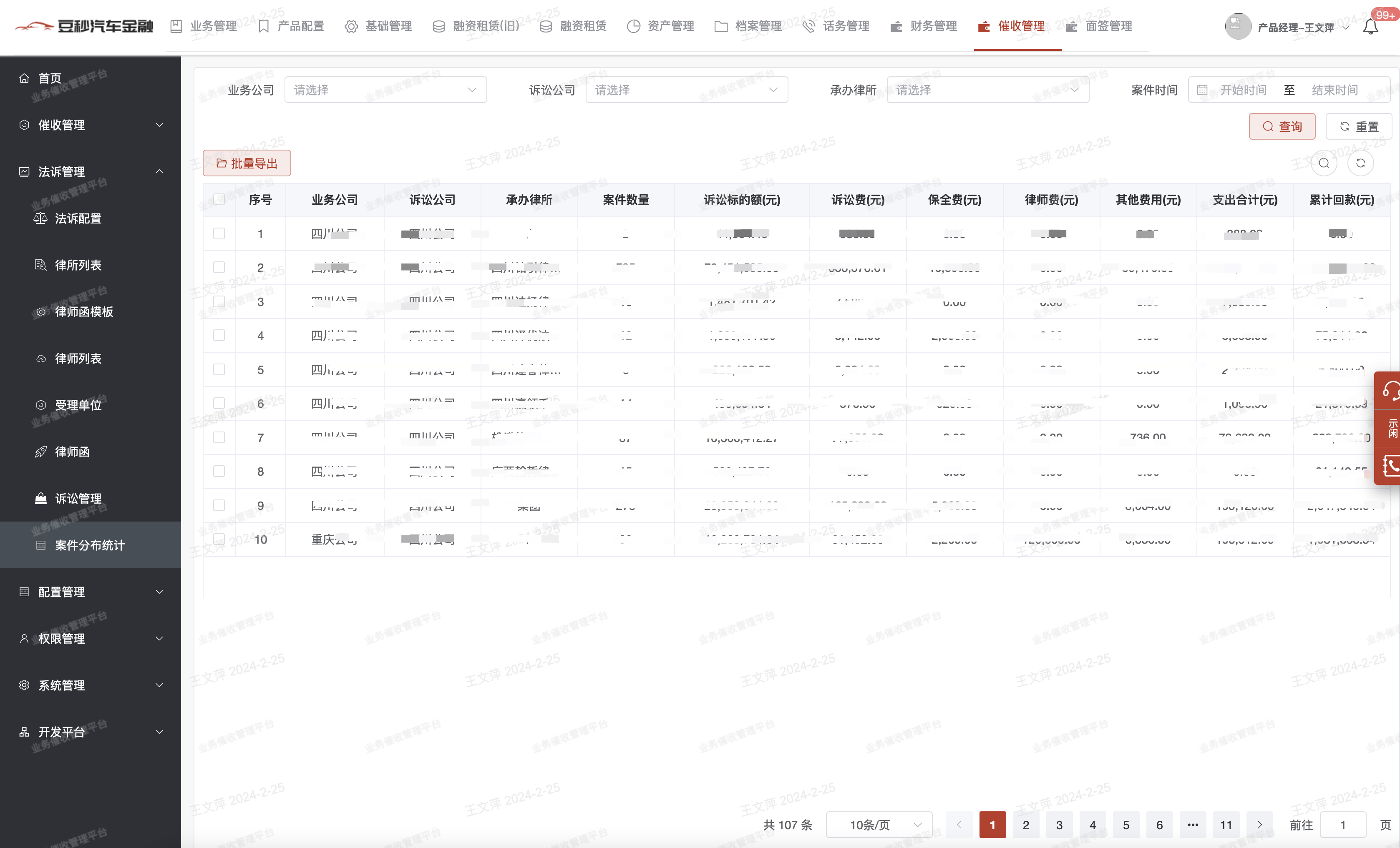 1、模块说明:展示从业务公司和诉讼公司纬度统计金额数据;2、权限说明:业务公司看自己,集团看所有;3、搜索:支持业务公司、诉讼公司、承办律所、案件时间范围进行检索;4、列表:支持批量导出; 文档更新时间: 2024-03-29 14:24 作者:admin